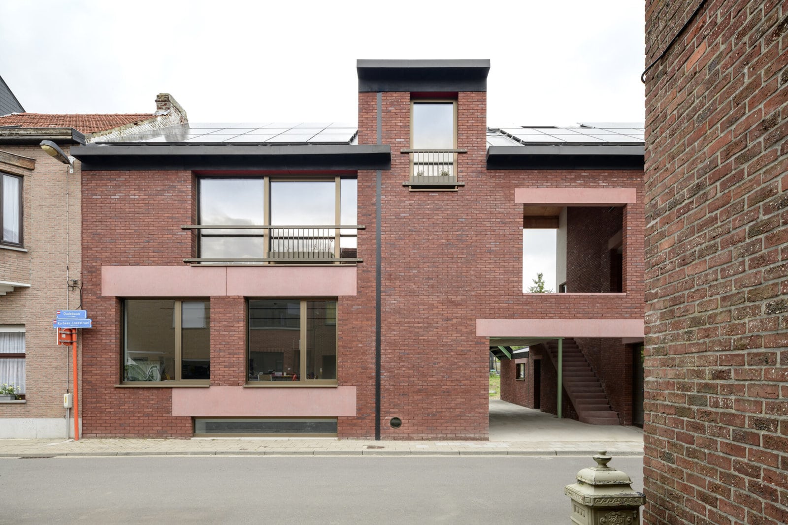 Sofie en David met hun vier kinderen namen het initiatief om haar ouders, An en Ludo, en broer Peter, en zijn zus Sarah met drie kinderen mee in het project te betrekken. De architecten ontwierpen deze woning dus voor een ‘uitgebreide familie’, een term uit de culturele antropologie voor een kerngezin, aangevuld met andere familieleden. De vier huishoudens delen geen leefruimte, maar wel een gemeenschappelijke tuin en binnenstraat, een wasplaats en ondergrondse berging. Omdat ze geen leefruimte delen, gaat het hier volgens de definitie van de provincie Vlaams-Brabant niet om ‘co-housing’, maar om ‘co-wonen’. Om de combinatie co-wonen en binnenstraat mogelijk te maken, puzzelden de architecten in plan en snede met vier woontypes: een deels ondergrondse duplexwoning met patio en vier slaapkamers, een gelijkvloerse levensloopbestendige woning, een duplex op niveau 1 en een meer traditioneel appartement.