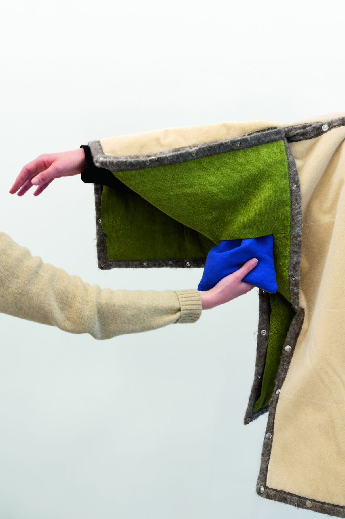 In haar voorstel beslist Morin om niet onze ruimtes, maar wel onze lichamen op te warmen. Ik ondervind het aan den lijve wanneer ik voor het eerst et al.1 in de Marollen in Brussel binnenwandel. Al snel kom ik fysiek in aanraking met haar textielobjecten, die her en der in de ruimte verspreid liggen. Wat opvalt is dat ze allemaal uit eenzelfde T-vormige element zijn opgebouwd en op modulaire wijze in vorm en gebruik kunnen veranderen; sommige hangen op, andere tonen zich als tafelkleed en weer andere liggen op de grond. Het zijn deze laatste die ik aanraak wanneer curator Roxane Le Grelle me uitnodigt om op de grond te gaan liggen, waardoor ik me anders ga verhouden tot de ruimte en tot de ander. Ik ontmoet er Kris De Decker, die me vertelt over zijn uitgave Heating People, not Spaces. Louise liet zich door zijn werk inspireren, maar ook door talrijke culturen, waaronder de Vlaamse cultuur met zijn rijke textielverleden. 1 et al. is een ‘architect-run space’ gewijd aan architectuur, opgericht door Architecture Curating Practice in juni 2023. Het biedt een podium voor dringende kwesties en sociale vragen binnen de architectuurdiscipline door middel van verschillende formats zoals residenties, discussies, tentoonstellingen, performances, workshops of lezingen. Het werk van Louise Morin is er te zien van maart tot mei 2024.
