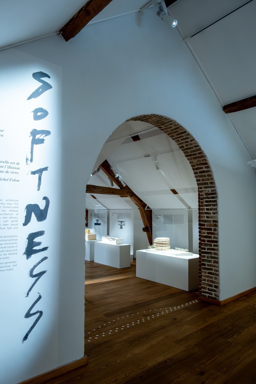 Kuma schikte de projecten in de Fondation Folon rond vier thema’s: Lichtheid, zachtheid, natuur en geometrie. Qua opzet vertoont de tentoonstelling een opmerkelijke gelaagdheid, een essentieel aspect van Kuma’s werk. Zijn gebouwen stellen nooit een harde grens tussen binnen en buiten in, maar verdoezelen die overgang door geraffineerd opgebouwde schermen in bamboe, hout, steen, glas of andere materialen.