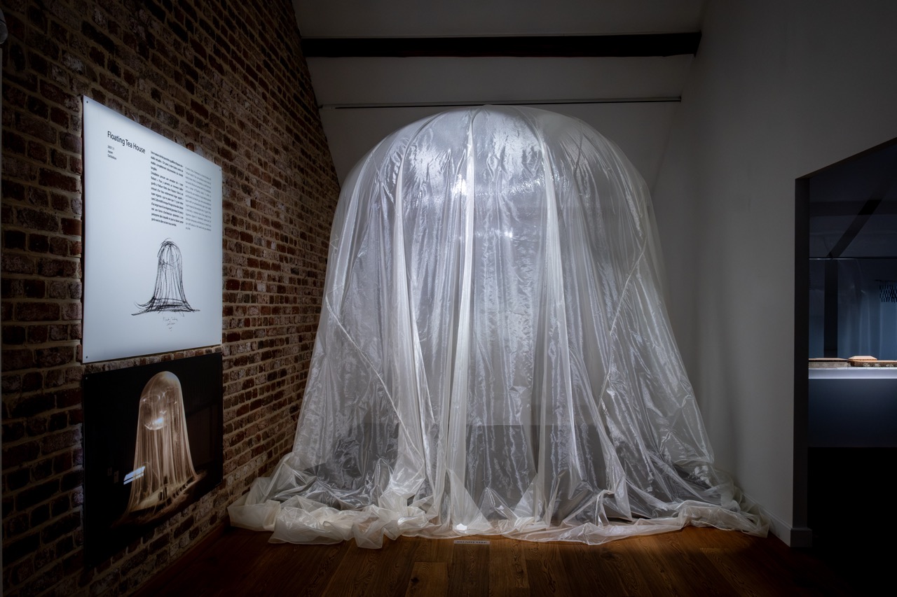 Een enkele keer, bij de ingang en in de sectie ‘Zachtheid’ doorbreekt een concrete demonstratie van een materiaal die strikte opbouw. Het materiaal wordt dan drager van een heel idee. Floating Tea House (2007) bestaat zo uit een ballon gevuld met helium waar een extreem lichte voile van reflecterende organza overheen gedrapeerd is. Voor Kuma representeert het werk een alternatieve droomwerkelijkheid. Een ander voorbeeld is Tetchan. Een hoek van de zolder is bekleed met het warrige, veelkleurige materiaal dat het ontwerp voor het Tetchan café in Tokio (2014) bepaalde.