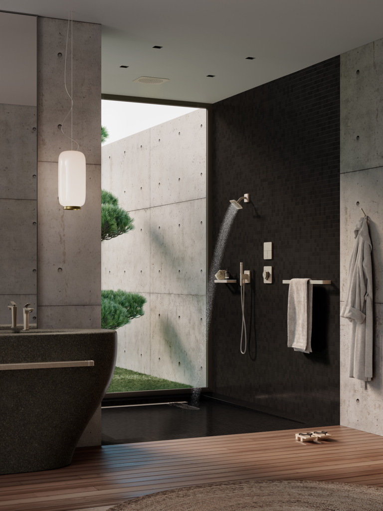 AXOR Citterio C is beschikbaar voor wastafel, bad en douche, waardoor designkeuzes en texturen consequent kunnen worden doorgetrokken in de hele badkamer. Deze continuïteit zorgt voor een rustige, samenhangende ruimtelijke beleving, met ruimte voor subtiele variaties per zone en gebruik.