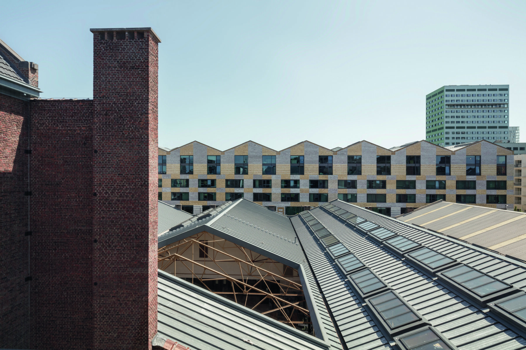 “De belangrijkste reden waarom we dit ontwerp hebben kunnen realiseren, is dat we de stedenbouwkundige regels aan onze laars hebben gelapt”, legt Mechthild Stuhlmacher uit. Bij de ontwikkeling van het masterplan week KSA af van het RUP. De architecten vervlochten de gevraagde programma’s met elkaar. Door het opgegeven gesloten bouwvolume in vieren te snijden en de onderdelen een kwartslag te draaien, kreeg de school de nodige bouwdiepte en werden uitzichten op het water gerealiseerd. Opdat er een samenhang zou ontstaan tussen de drie verschillende gebouwen benaderden de architecten de complexe schoolomgeving als een campus. Stuhlmacher neemt ons mee op een chronologische wandeling, van het oorspronkelijke schoolgebouw van Van Averbeke door de loodsen en naar de nieuwbouw.
