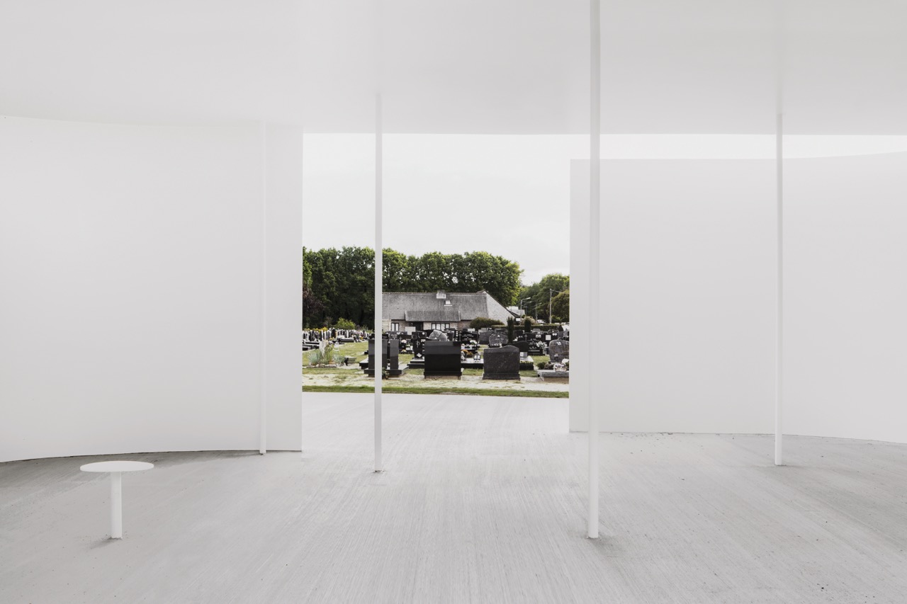 The tight budget for the farewell space was fixed from the outset and called for a simple design. Hans Maes limited himself to constructing a roof, two walls and ten columns. He detailed and positioned these essential elements with such precision that all additional elements that might distract attention, such as supporting beams and gutters, were rendered superfluous. ‘A space sheltered from wind and rain could, of course, simply be a bus shelter, but a farewell ceremony does call for a certain symbolism and experiential value,’ he says.