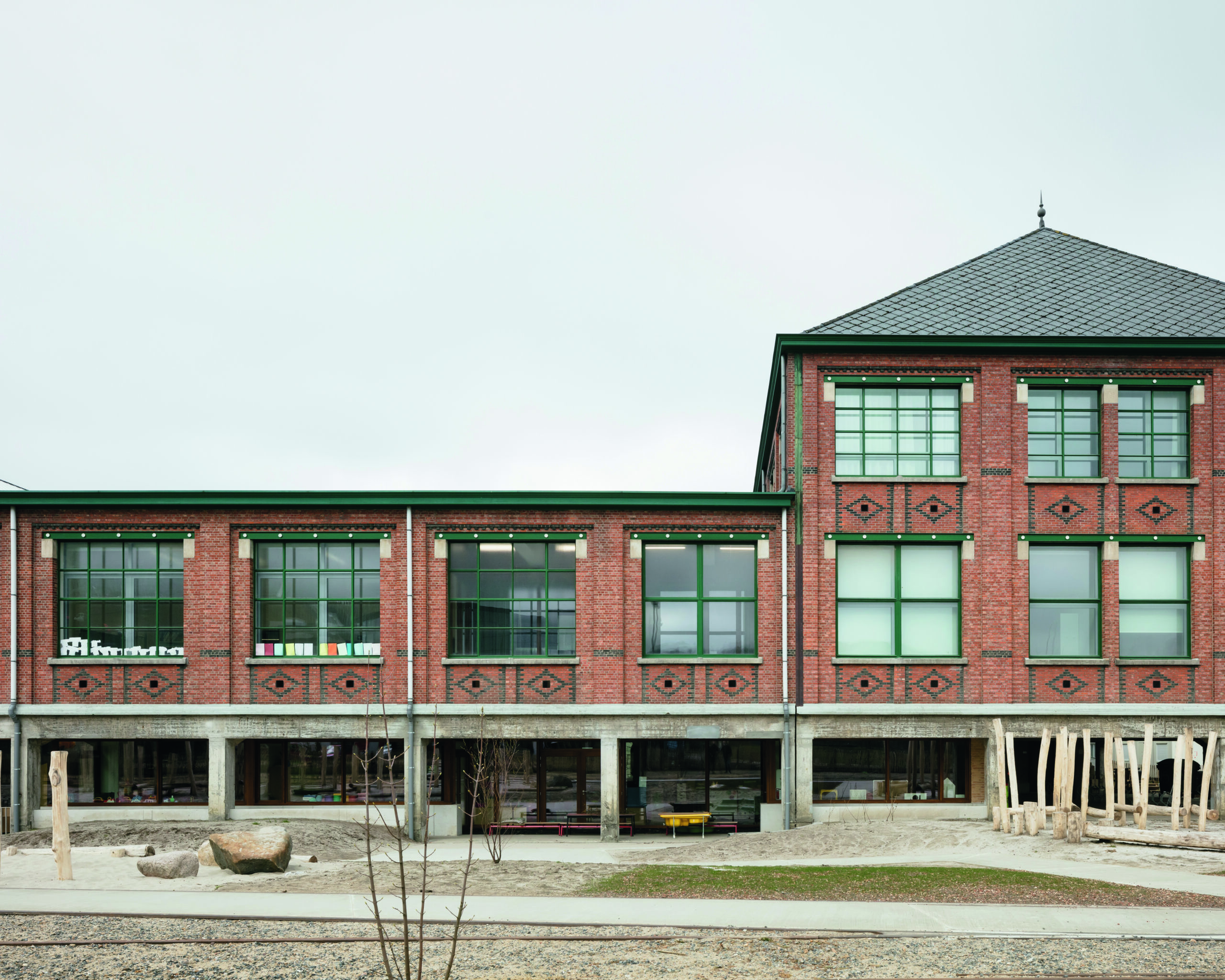 Once upon a time, no one even bothered looking at them, but today the sheer size and quality of Beringen’s mine buildings leave visitors stunned. The storage for the minecarts and the space for the miners’ clothing lockers required a structure measuring 21 by 127 metres! That colossal ‘shed’ now houses the free kindergarten and primary school Straf! The renovation by a2o and AAC serves the school’s educational project with admirable simplicity.