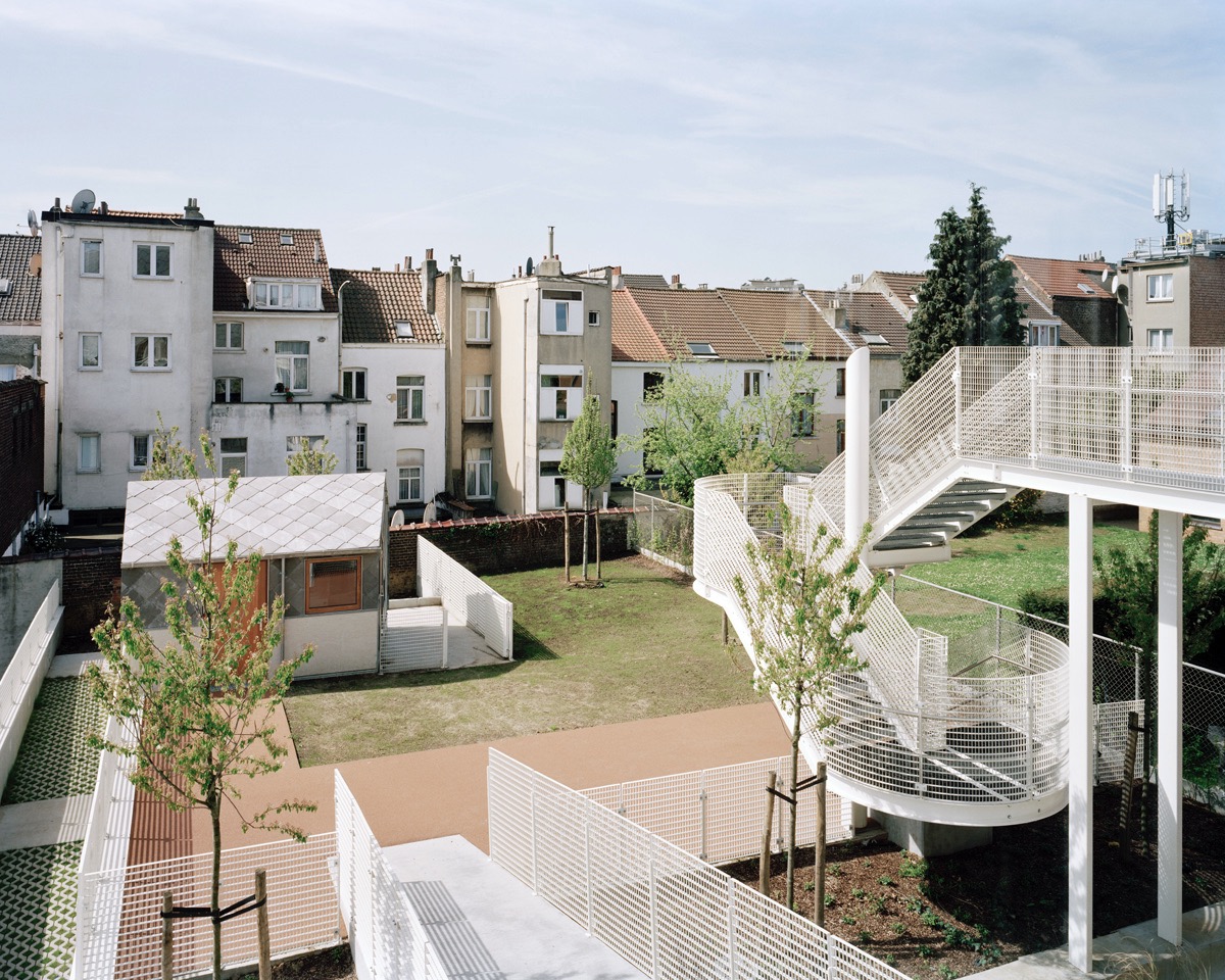 The practices of Bernard Deffet and Yves Delincé have long shared offices on Rue Bois-l’Évêque in Liège. Their temporary partnership to create a municipal crèche provides an opportunity to combine their specialisms: urban planning for the former and early childhood programmes for the latter. The project, initiated by the Koekelberg Historique sustainable neighbourhood contract, goes beyond the scale of a single building by producing an urban response that forms part of a medium- and long-term process, aiming to close off the block situated between Rue Émile Sergijsels and Rue de la Sécurité. Together, they worked on the various phases (nursery, shops, housing) as successive stages that could be carried out independently of one another. However, in the end, the local council abandoned the ambition of a mixed-use development on the site, and only the nursery was built.