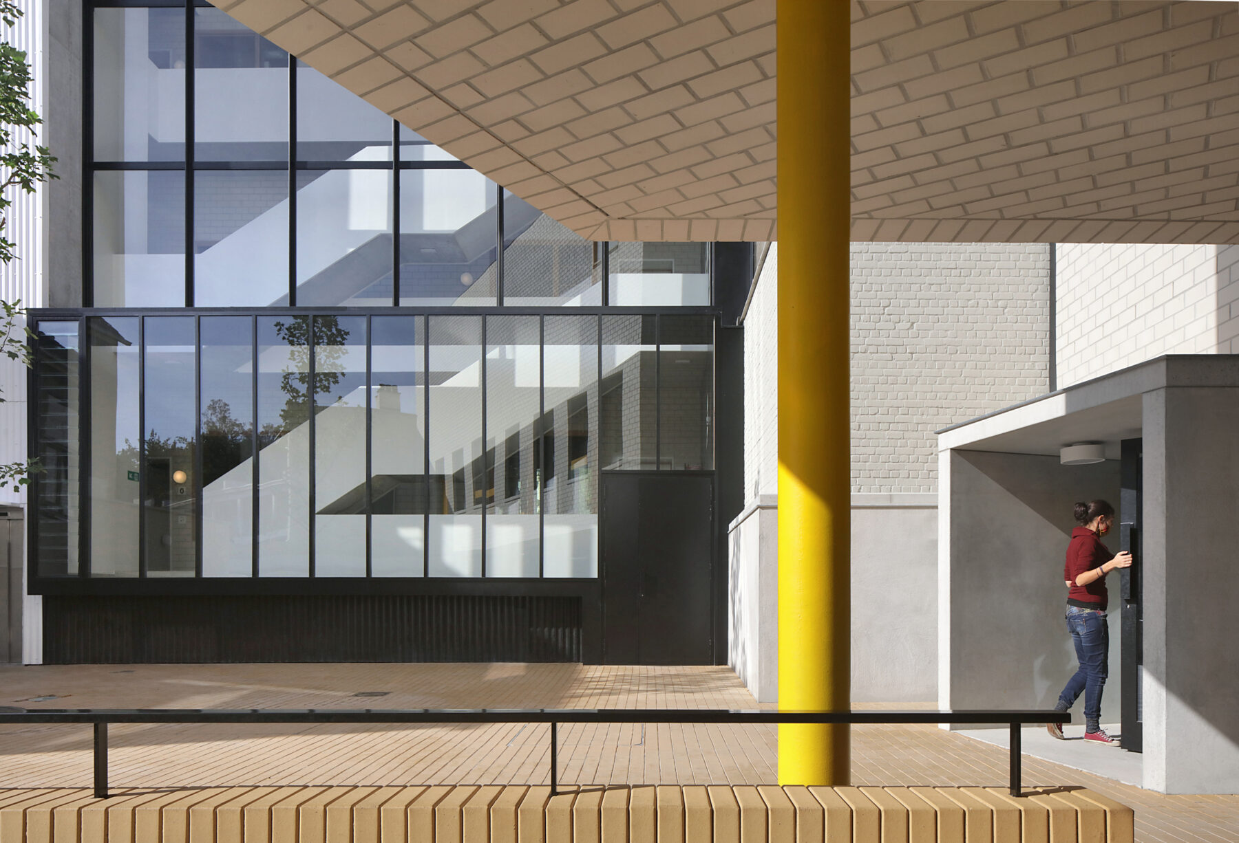 Pour différentes raisons – acoustique, accessibilité, cloisonnement –, la relation entre une école et ses abords requiert davantage d’attention que d’autres missions. Il arrive toutefois souvent que le contexte prenne le pas sur d’autres aspects du programme et de la composition, a fortiori dans un pays aussi urbanisé et densifié que la Belgique. La liberté dont ont par exemple bénéficié les Smithson en 1949 pour la construction de la Hunstanton School sur un grand terrain dégagé à Norwich est devenue en 2023 une exception qui relève du privilège. Dans le rapport du concours rédigé à l’époque, on pouvait lire que la forme de l’école « est dictée par une étude minutieuse des besoins éducatifs et d’exigences purement formelles plutôt que par des précédents ».