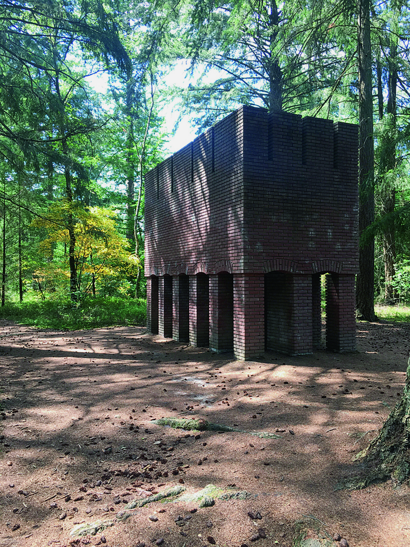 « Per Kirkeby a construit l’oeuvre intitulée Brick Hut en 1988 pour le musée Kröller-Müller aux Pays-Bas. Cette oeuvre est une de ses nombreuses sculptures architecturales. Vu notre enthousiasme face à son répertoire, nous aurions aussi bien pu choisir une de ses autres sculptures, mais nous apprécions particulièrement la Brick Hut pour la puissance de son esthétique et la splendeur de son implantation. Le bois environnant crée une scénographie parfaite ; la manière dont le petit édifice apparaît entre les arbres est d’une beauté exceptionnelle. Malgré – ou peut-être précisément grâce à – la grande simplicité de l’objet en briques, il en émane une forte monumentalité. Le contraste avec la nature environnante éveille une admiration presque primitive pour l’acte de construire.