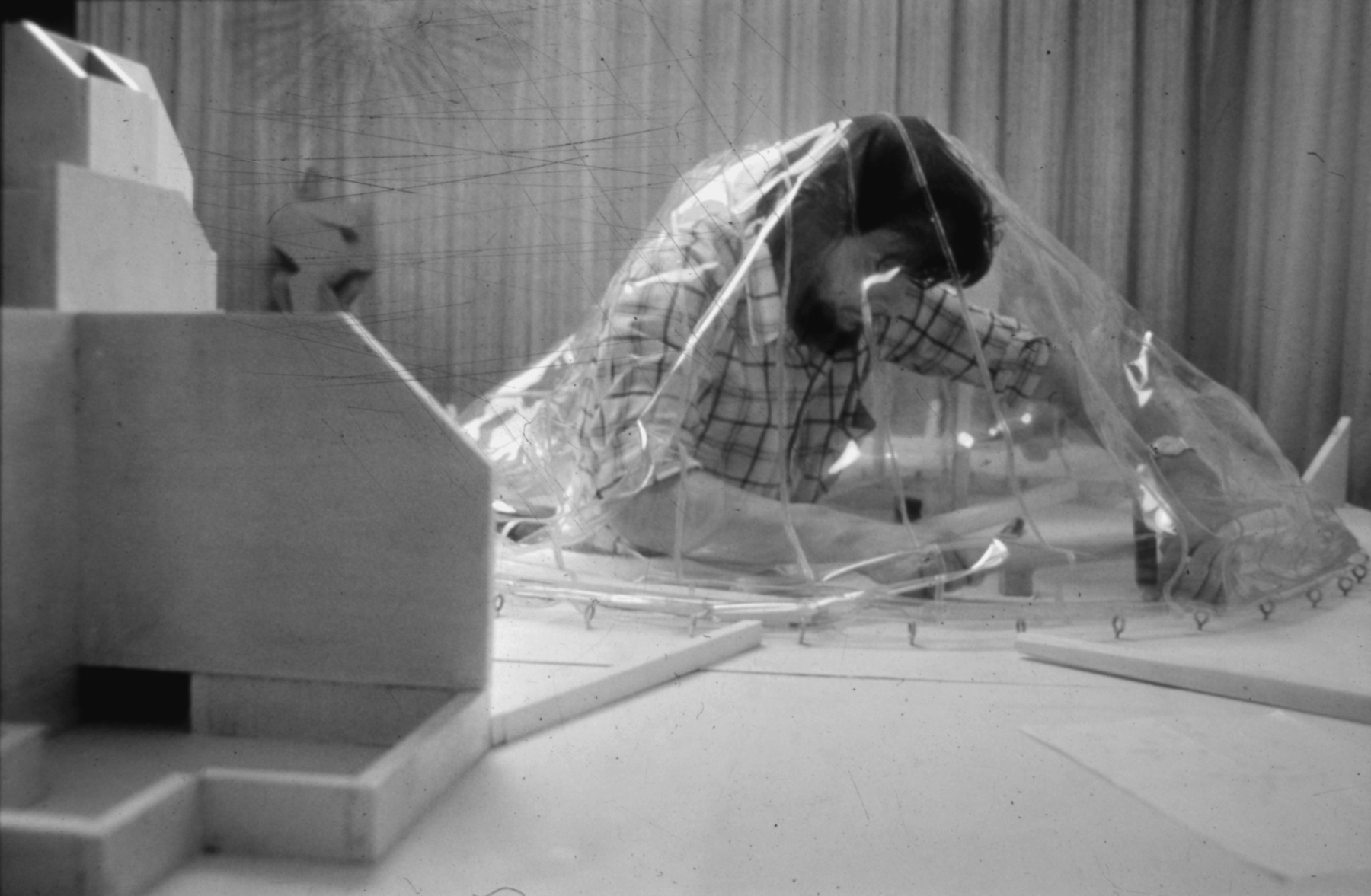 Cela semble également expliquer pourquoi il ne joue pas lui-même le rôle principal dans cette exposition monographique. En effet, un seul et unique sujet lui vole la vedette : la « maison ballon » temporaire qu’il avait lui-même conçue à Humbeek et où il a habité avec sa famille de 1973 à 1982. Ce projet consistait en une sphère gonflable de 14 mètres de diamètre, flanquée de part et d’autre de deux voiles inclinées. À l’intérieur du ballon, une structure de poteaux abritait l’espace parental, tandis que les deux voiles recouvraient respectivement le carport et l’annexe modulaire réservée aux enfants. C’est dans l’espace ainsi créé sous et entre ces structures, et recouvert par le ballon, que s’écoulait la vie de famille, en contact étroit avec l’environnement. Conçue pour être utilisée dix ans avant d’être démontée pour laisser la parcelle quasi intacte, cette maison-ballon a toutefois connu une fin de vie prématurée due aux chutes de neige de 1982.