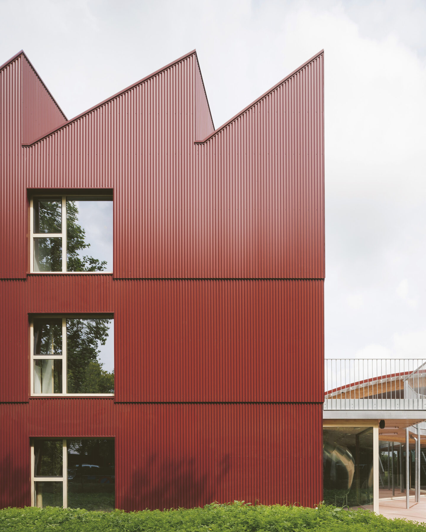 Progressivement, à l’orée d’un bosquet, apparaît une tour à redans partiels, immédiatement suivie par un hangar cintré. Ces bâtiments font partie d’un triptyque tactile de structures reliées entre elles par l’auvent en arc de cercle. Sur le site dédié aux jeunes d’Eernegem, en Flandre occidentale, les formes élémentaires de la composition parlent à l’imagination de tout un chacun. Dans sa grande simplicité, le projet de Raamwerk, qui abrite une crèche parascolaire et une aire de jeux pour les enfants, est un point de référence très clair. Ce complexe, qui accueille également une salle de sport et le mouvement de jeunesse local, est un premier pas vers le redéploiement du site, dont il est également la pièce finale.