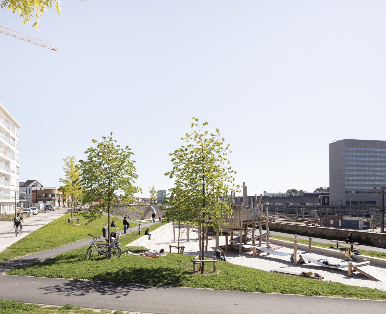 Petit à petit, les habitants de Louvain eux-mêmes ont du mal à se souvenir de ce qu’était jusqu’à récemment la Martelarenlaan à Kessel-Lo. Après la Seconde Guerre mondiale, cette liaison longeant les voies de chemin de fer entre les chaussées de Diest et Tirlemont a dégénéré en une autoroute urbaine, malgré la forte densité d’habitat. De l’autre côté de ce « fleuve de fer », il ne subsistait de la « belle vue » sur Louvain qu’un parking pas très ordonné. L’avenue marqua ainsi la rupture entre la ville et sa périphérie immédiate. Le nouveau parc Belle-Vue, d’après un projet de H+N+S, Artgineering et ARA, avec son imposante vue sur le chemin de fer et la ville, a apporté un changement radical. L’endroit est immédiatement devenu un point de rencontre pour le quartier et un carrefour dans un réseau de randonnées cyclables et pédestres.