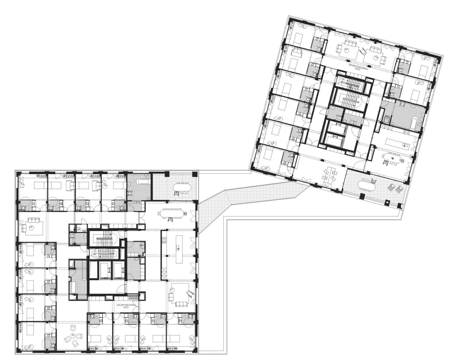 Aan een klein veldweggetje in Geel is een uitgestrekt woonzorgcentrum ontstaan, ontworpen door Osar, dat tegelijkertijd optreedt als opdrachtgever onder de naam van de vzw Astor. Klein Veldekens omvat maar liefst 168 bedden voor woonzorg voor ouderen en 30 bedden voor de geriatrische zorg van mensen met een ernstige mentale en fysieke beperking. 1 Het centrum is gelegen op een open terrein van 3,2 ha te midden van een wijk met eengezinswoningen. De kern wordt gevormd door een robuuste toren van 12 verdiepingen met individuele zorgstudio’s op een plint waarin een restaurant en een dienstencentrum zijn ondergebracht. Verschillende gebouwen zijn verspreid over het terrein, met een dagopvang, een crèche, commerciële ruimtes, zorgappartementen, gastenkamers en zorgwoningen. 1 De 30 bedden voor mensen met een ernstige beperking maken deel uit van een samenwerkingsverband met het Medisch Pedagogisch Instituut MPI Oosterlo.