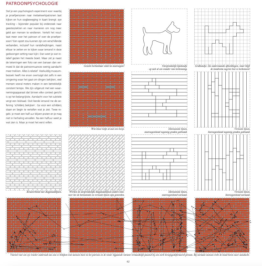 Het Zinderend Oppervlak van Koen Mulder is een heroïsche poging om die kennislacune te dichten. Als dit boek één ding aantoont, dan wel dat een metselverband meer is dan een manier om stenen te stapelen. Het is een denkwijze, en zelfs een esthetica. Elk verband definieert immers een complexe relatie tussen constructie en beeld. Het wordt primair bepaald door een specifieke stapeling. Die resulteert in beeldbepalende ‘kettinglijnen’, de denkbeeldige lijnen die lopen langs laag om laag boven elkaar geplaatste koppen. Elke stapeling vraagt ook andere oplossingen voor hoeken en raamopeningen. En dan is er nog het spel van de voegen: verdiept, schuin, platvol, licht of donker, gesneden, dik of dun… Zelfs een simpele steen met een maatverhouding 4:2:1 laat zo talloze verbanden toe.
