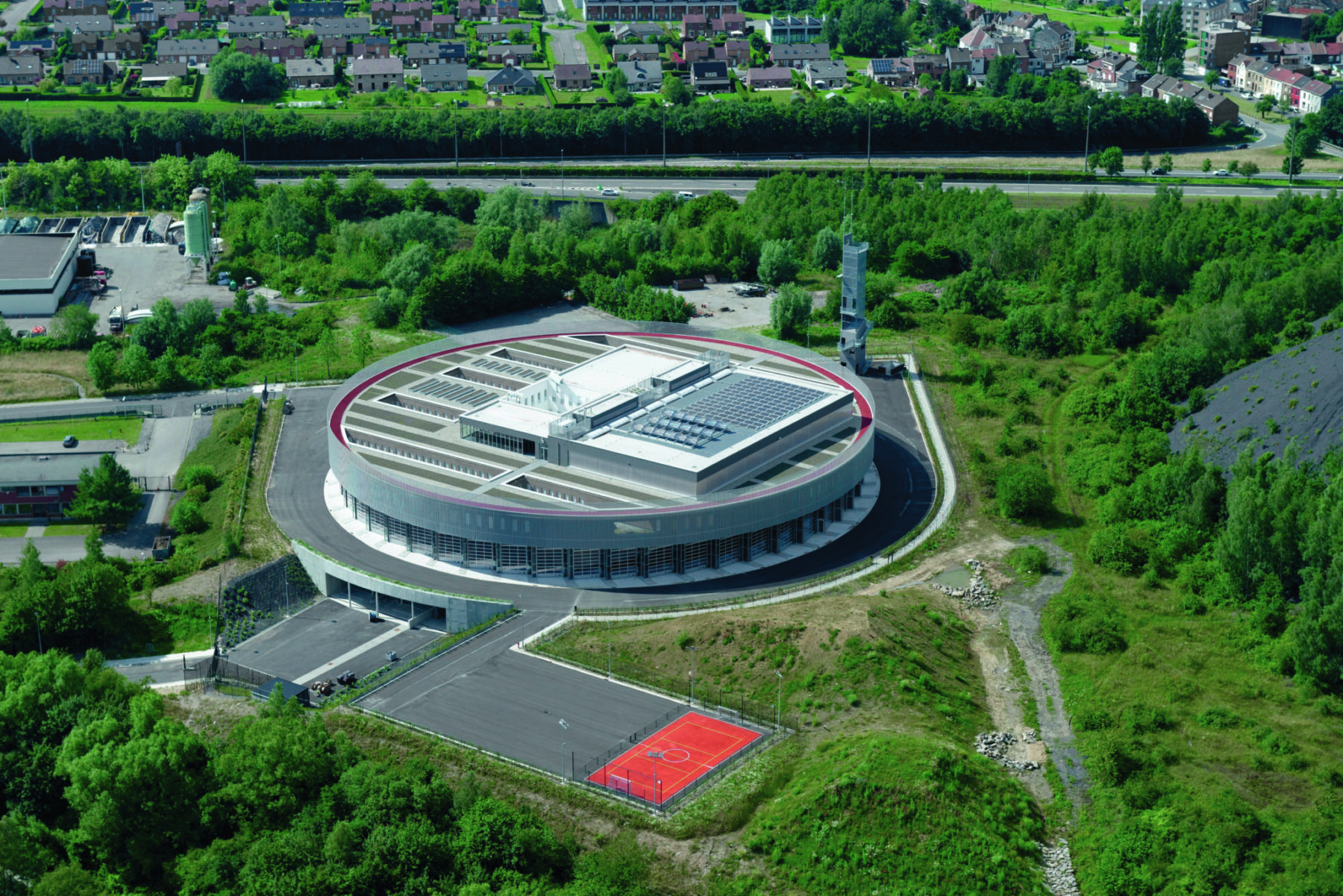 In de schaduw van de terril van Hiercheuses, een overblijfsel van het mijnverleden van de streek, galmen sinds 2016 de sirenes van de brandweerkazerne van Charleroi. Het gebouw beschrijft een perfecte cirkel met een diameter van 90 meter. Het heeft een zuivere, herkenbare vorm en wordt omringd door arbeidershuisjes en de snelweg aan de rand van de stad.