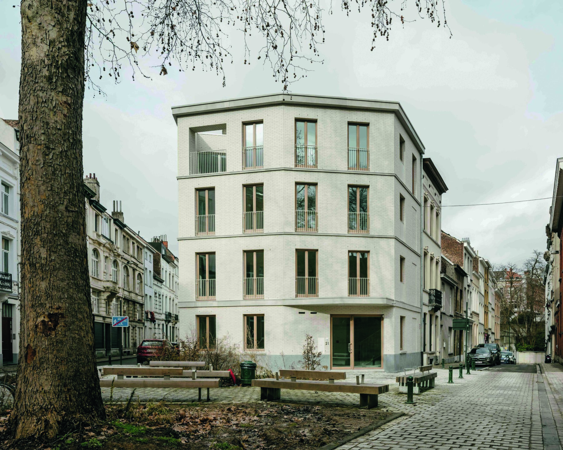 Op de punt van een driehoekig stadsblok in Elsene begrenzen een nieuw kopgebouw en een oude plataan een behaaglijk pleintje. De elegante pas de deux tussen boom en bouwsel voegt zich met grote vanzelfsprekendheid in de bestaande context – zodanig zelfs dat de jury van de Brussels Architecture Prize in eerste instantie aan het genomineerde project voorbijreed. Toch is het ontwerp van het Brusselse architectenbureau Vers.a allereerst het resultaat van een uitgesproken modern gesprek met opdrachtgevers en omwonenden. Dat de behandeling van de façade is voortgekomen uit een nauwgezette studie van de directe omgeving maakt dat het resultaat van dat gesprek zich inderdaad moeiteloos schikt in de historische context.