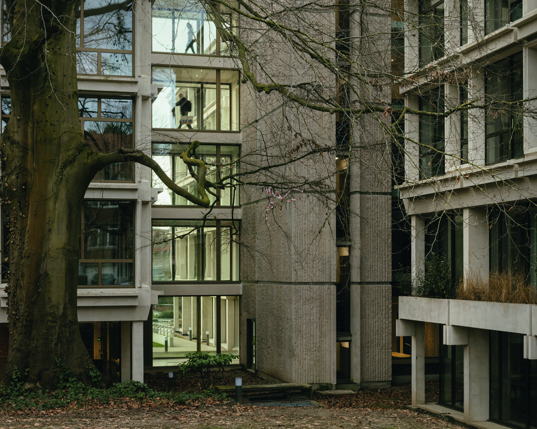 Vóór de verbouwing was het vrijstaande Fabricom-gebouw nagenoeg onzichtbaar door muren aan de straatzijde en een park eromheen. Archipelago brak die muren af en maakte het park publiek toegankelijk. Ze verplaatsten de hoofdingang ook van de sterk hellende Gatti de Gamondstraat naar de Stallestraat. Het hoogteverschil tussen straat en gebouwen losten ze er op met trappen en een hellingbaan in een weelderige voortuin.