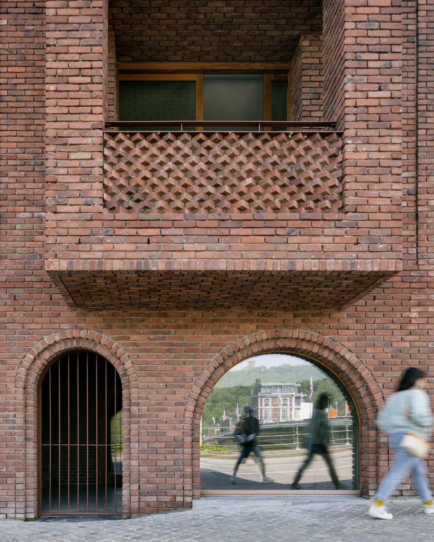 In deze context streefden de architecten naar een harmonieuze overgang tussen de uiteenlopende stijlen en volumes van de omliggende gebouwen. Zo ontleent de compositie van de eerste twee verdiepingen kenmerken aan beide buren: de hoogte van de gevelplint en de aanwezigheid van een erker op de bel-etage verwijzen naar de burgerwoningen, terwijl de rondbogen op de begane grond aansluiten bij de vormentaal van religieuze gebouwen. De genuanceerde tint van de baksteen draagt bij aan de subtiele integratie van het gebouw in de stedelijke omgeving.